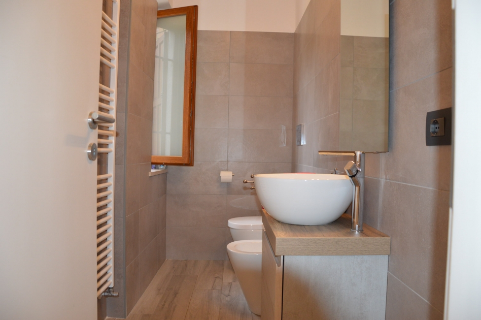 -P. primo di ca 105 mq: disimpegno, tre camere da letto, una stanza adibita ad oggi come cabina armadio, bagno finestrato con la doccia. Dalla cabina armadio e da una delle camere, si può accedere alla terrazza verandata di ca 22 mq.