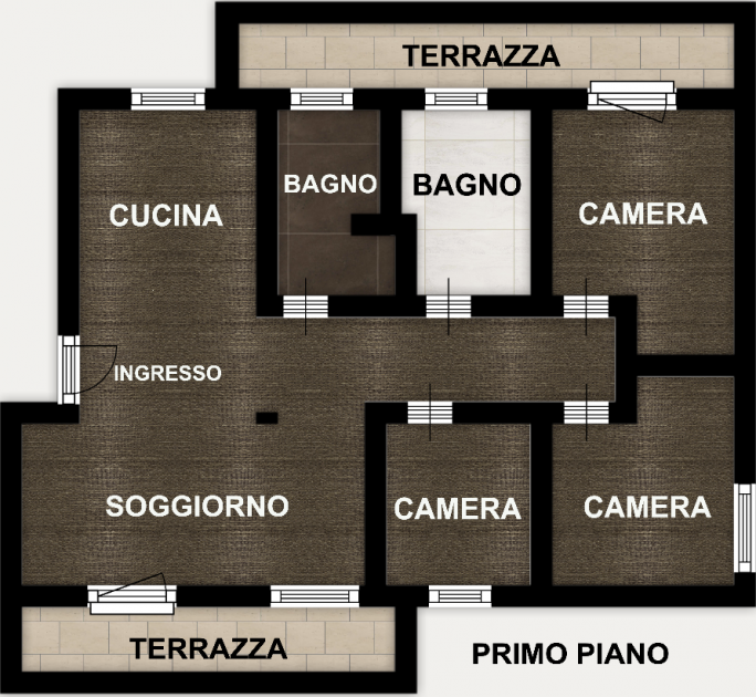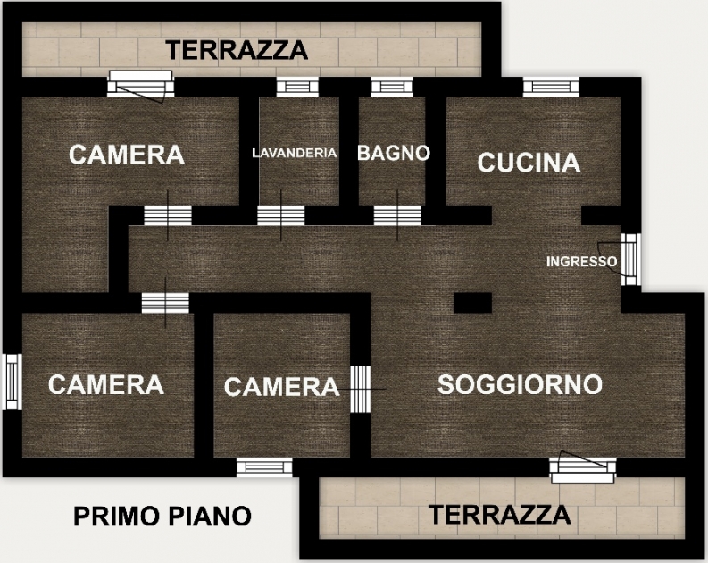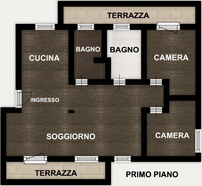 PRIMO PIANO: appartamento di circa 115 mq, ingresso su zona open space con uscita su terrazzo di circa 13 mq, due bagni uno dotato di vasca e uno con doccia, due camere matrimoniali di cui una con uscita sul terrazzo di circa 8 mq.