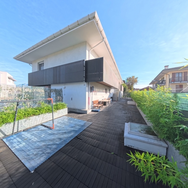 Esternamente vi sono sia due posti auto scoperti che una zona piastrellata ed in parte piantumata che garantisce un ottimo sfogo alla proprietà.