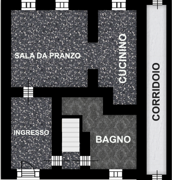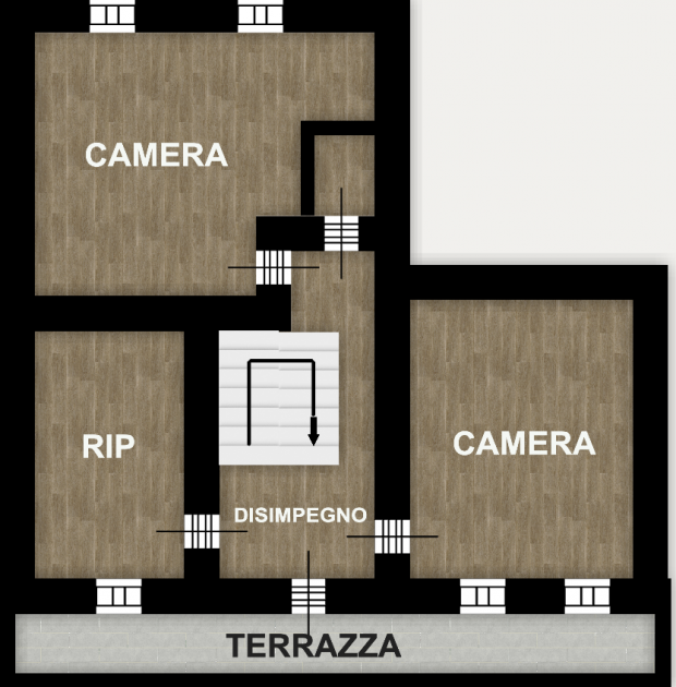 P.PIANO: di circa 55 mq, disimpegno notte dante accesso alla terrazza, due camere e ulteriore stanza.