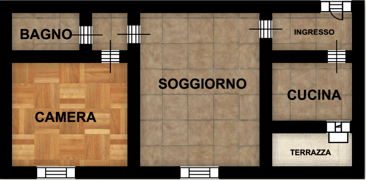 Riscaldamento autonomo a metano, infissi in legno doppio vetro con tapparelle, condizionatore, piastrelle nella zona giorno e nel bagno, parquet nella camera da letto, terrazzo di c.a 5 mq e posto auto coperto.